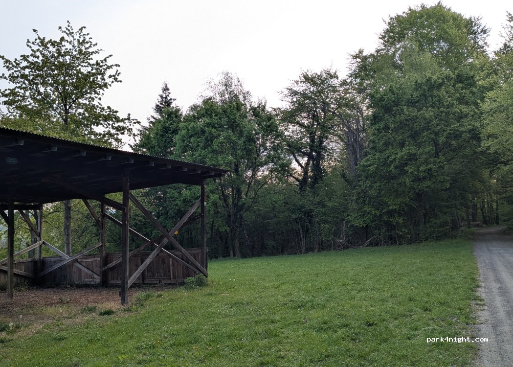 Amplia zona verde con una vista muy bonita, incluso hay un gran refugio. El terreno está un poco inclinado pero es posible estabilizar la furgoneta. Sin límite de altura, cerca de un camino forestal, no vi ningún coche pasar. Solamente caminantes o ciclistas. Noche tranquila, sin problemas. Muchas plazas disponibles. Por favor, respete las instalaciones y conserve sus residuos consigo.