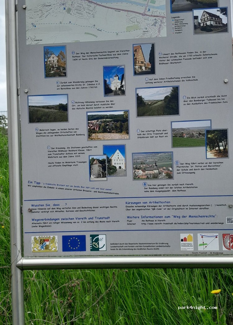 Ein sehr ruhiger, geschotterter Parkplatz direkt am Main! Offensichtlich nutzen Anwohner diesen Platz hauptsächlich zum Abstellen von Trailern + Lieferwagen! Von hier sind es 9 km super Fahrradweg bis Bamberg! Im Ort selbst findet sich der nette Gasthof Mainlust und im Nachbarort (2,6km) der Brauerei Gasthof Kundmüller! Danke an die Gemeinde Viereth für solch kostenfreien Parkplatz!