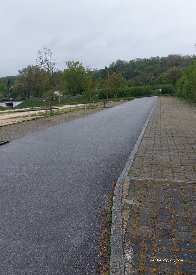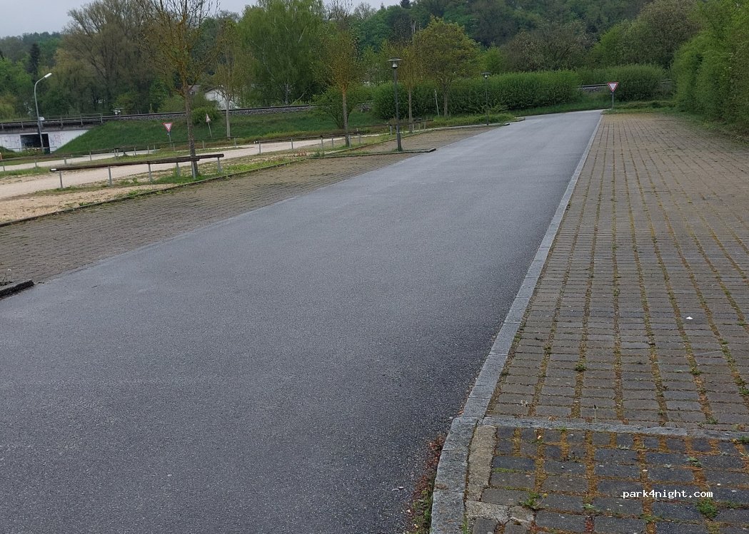 Amplio estacionamiento en un polideportivo. Parcialmente pavimentado, parcialmente grava. Completamente vacío por la noche, pudimos aparcar aquí sin ningún problema. Supermercado/panadería cercana.