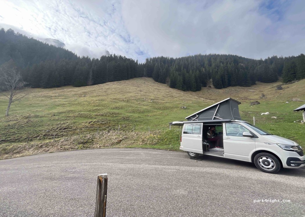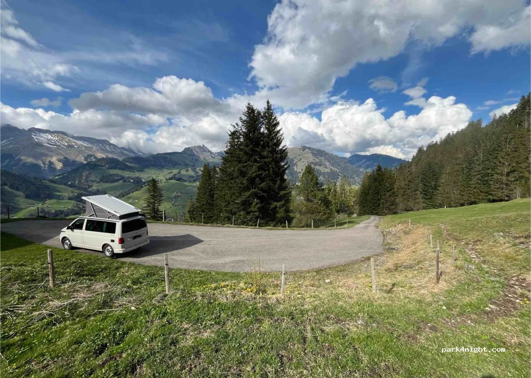 Petite place en goudron au bout d’une rue sans issue. Il y a un petit alpage en bout de route, fermé quand on est passé. Pas de passage, magnifique vue sur le Pays-d’Enhaut. Le lieu est légèrement en pente donc il faut prévoir des cales. Une petite pépite de la région ?