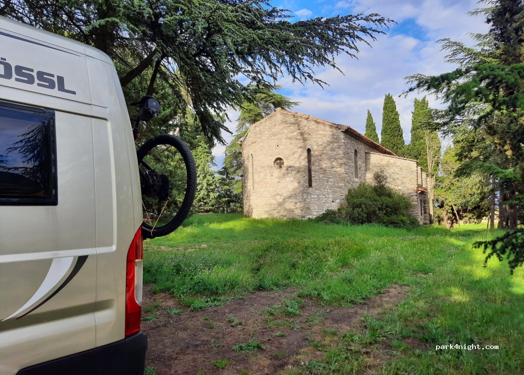 Ein schöner flacher Stellplatz für die Übernachtung an einer Kapelle. Etwas Abseits führt eine Straße vorbei, die allerdings wenig befahren ist. Bei den Tief hängenden Ästen der Bäume sollten hohe Fahrzeuge achtsam sein. Die Möglichkeit für mehrere Fahrzeuge ist gegeben, es können locker 4 bis 6 Mobile stehen.