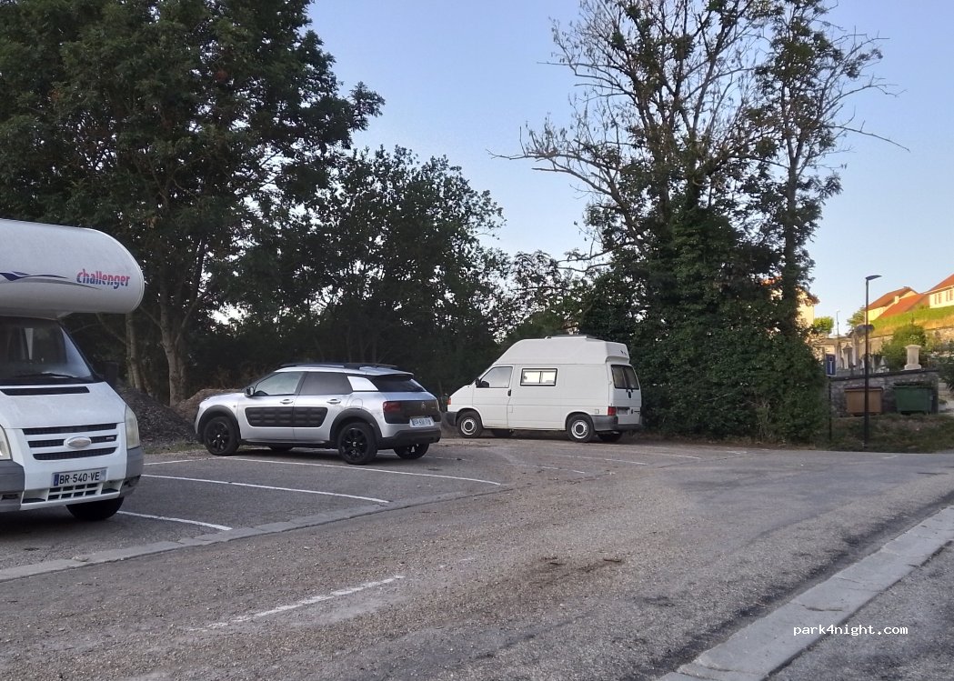 nuit calme. les deux routes qui bordent le parking ne sont pas très bruyantes. Le parking est à la vue des maisons du lotissement. bon plan les pizzas "chez Gabi".