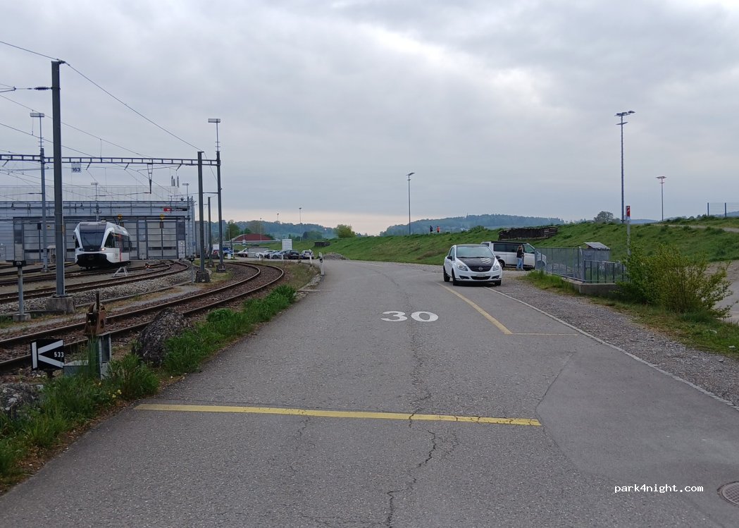 Notte tranquilla, poco rumore dai treni, perché passano dall'altro lato del deposito ferroviario. Nessun servizio ma buon compromesso, visto che non costa nulla e il parcheggio è esplicitamente consentito dal cartello fino al termine della striscia gialla.