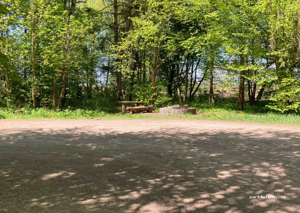 Here is a forest parking lot that also has space for RVs. It's partially level and has a table with a bench and a fire pit. Otherwise, there's no other infrastructure here.