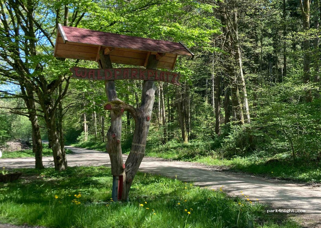Ebener Waldparkplatz neben der Strasse, die man in der Nacht etwas hört. Ideal für eine Übernachtung.