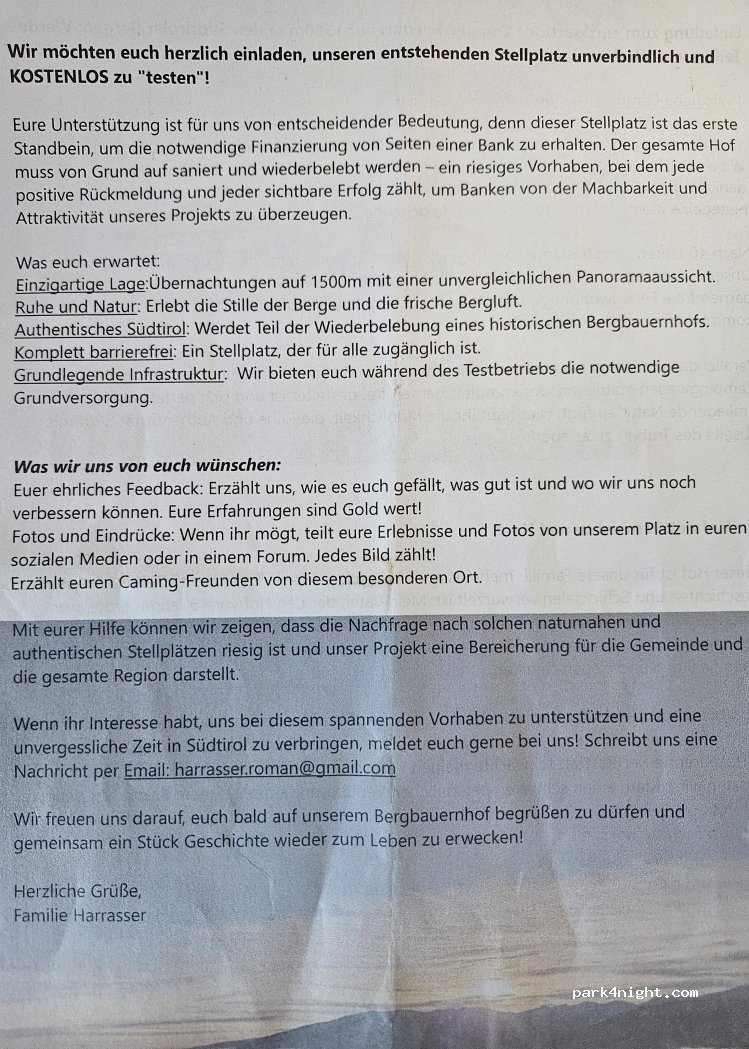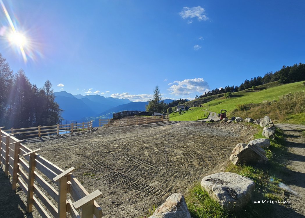 Einer der schönsten Plätze die wir gefunden haben. Dort soll ein Stellplatz entstehen, wenn die Genehmigungen vorliegen. Besitzer und Nachbarn sind sehr nett. Blick fantastisch, sehr ruhig. Direkt vorbei geht der Wanderweg 5B auf dem man nach 2km den Parkplatz Zumis erreicht. Nach ca. 300m sind die ersten Hütten zur Einkehr und von dort kommt man in das Wandergebiet Rodenecker Alm/Lüsener Alm.