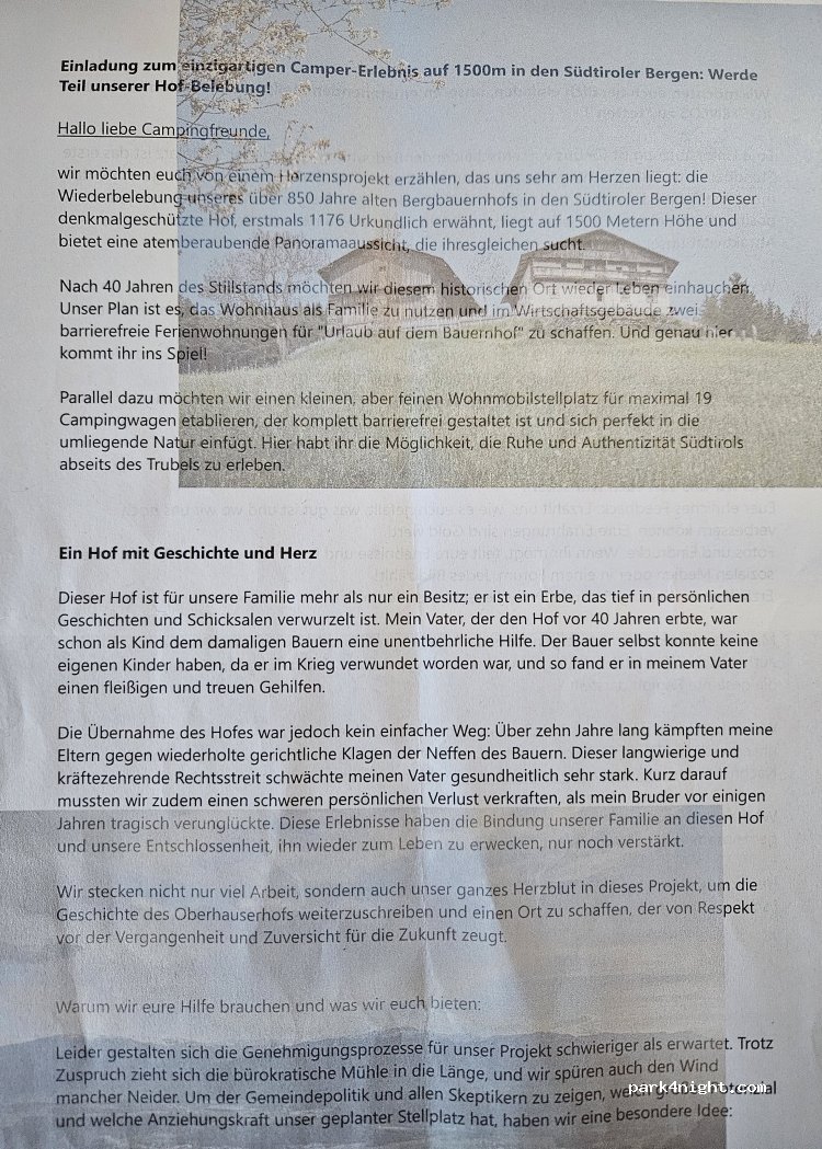 Super netter Kontakt! Mit einem 6m Sprinter problemlos zu erreichen. Toller Platz!!! Besonderheit: Er liegt fussläufig zum Gleitschirmstartplatz Rodeneck. Idealer Ausgangspunkt, um bei einem Flug die schöne Aussicht zu geniessen. Top Landung ist möglich, aber auch abhängig davon ob Weidevieh steht und die Bergwiesen gemäht sind. Klare Empfehlung und vielen Dank für die ruhige Nacht.