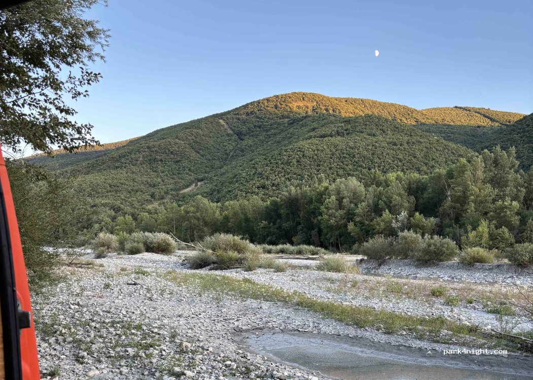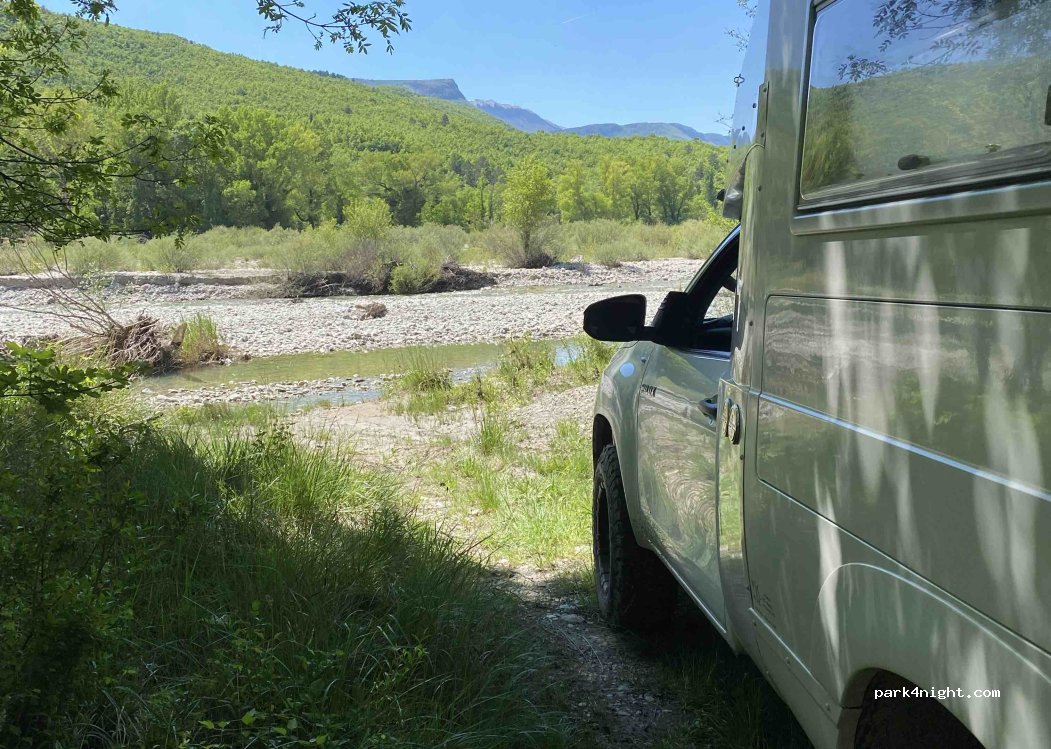 Beautiful picnic area by the river. I recommend a 4x4. The parking space is flat and under the road. I didn't sleep here, but it's conceivable.