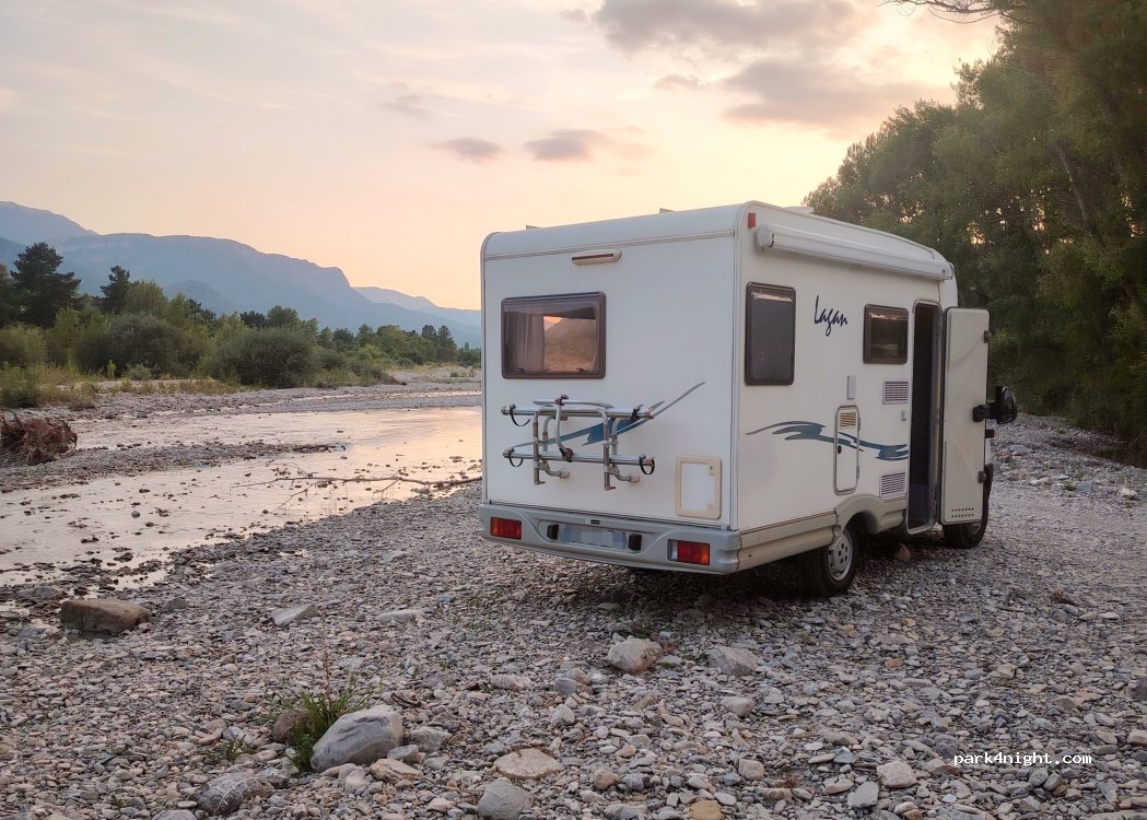 Agréable nuit passé au bord de la rivière. Assez étroit place pour un véhicule et compliqué pour véhicule supérieur à 6mde long… + a proximité de la route. Sinon possibilité de se mettre dans le champs à côté (voir photo)