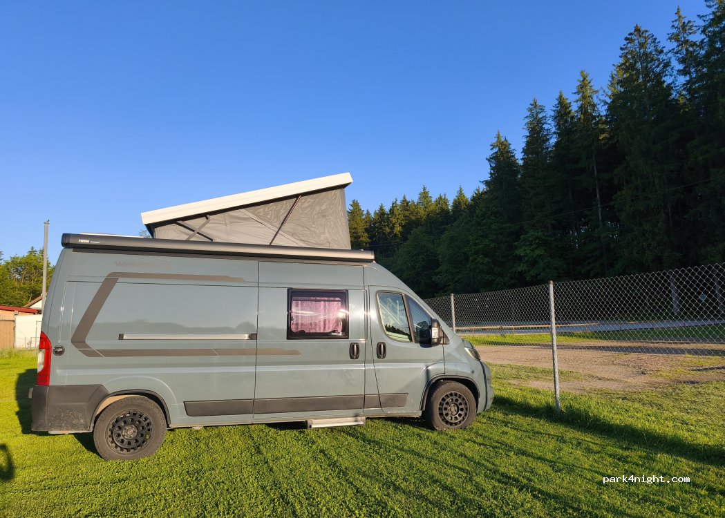 am Waldrand geparkt für einen Nacht. am Anfang der Zufahrtstrasse rechts gibt's morgens Schatten.