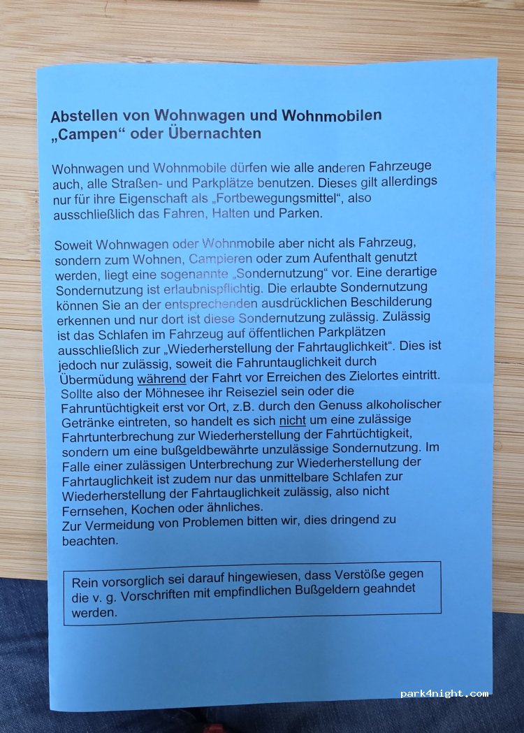 Weil dort mein Wohnmobil über Nacht gestanden hatte, wurde ich mit einem Verwarnungsgeld in Höhe von 35 € belegt und gleichzeitig unterstellt, dass ich dort übernachtet hätte. Einen Parkschein hatte ich gelöst und am Fahrzeug präsentiert. Auf ein Park- und/oder Übernachtungsverbot wird nicht hingewiesen. Nach meinem Widerspruch wurde das Verfahren eingestellt.
