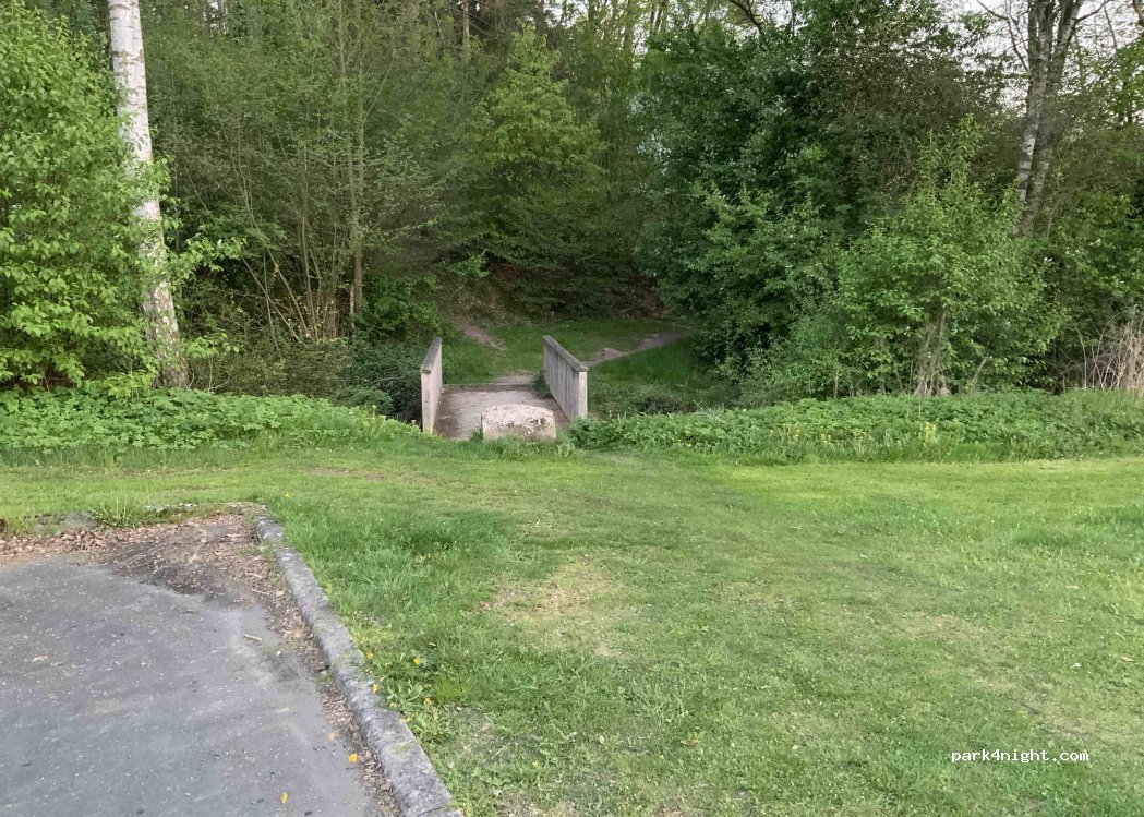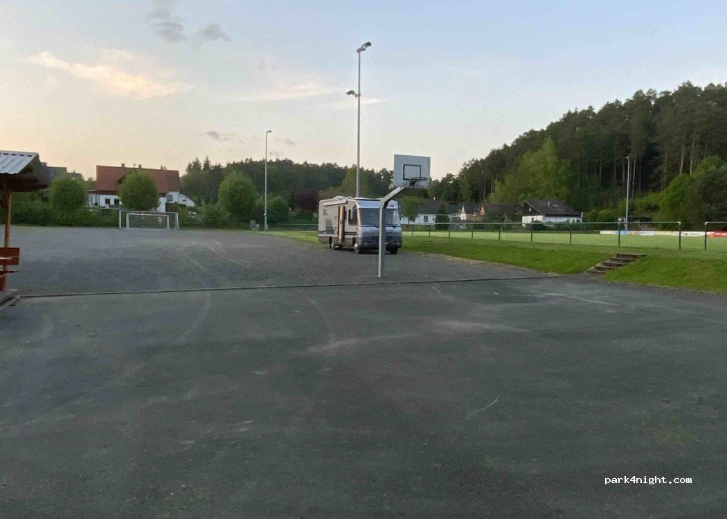 Aparcamiento para excursionistas al final de una calle sin salida. Aparcamiento simultáneo para el campo deportivo, la cancha de baloncesto y el TSV 1919 e.V. polideportivo. Sin señales de prohibición, mucho espacio.