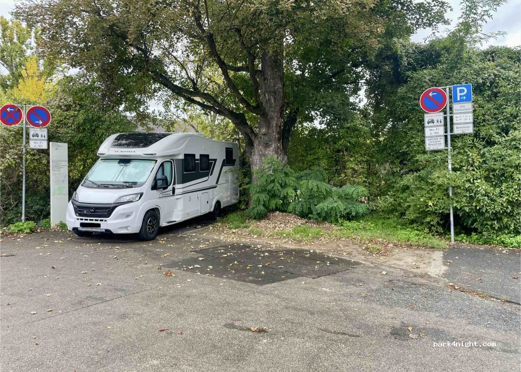 We spent a very quiet night here; in the morning, the first cyclists and walkers arrived. Super close to the center! One or two parking spaces for vehicles up to 7.50 meters, otherwise it gets tight! More suitable for campers. There are events on weekends, so it's a bit noisy.