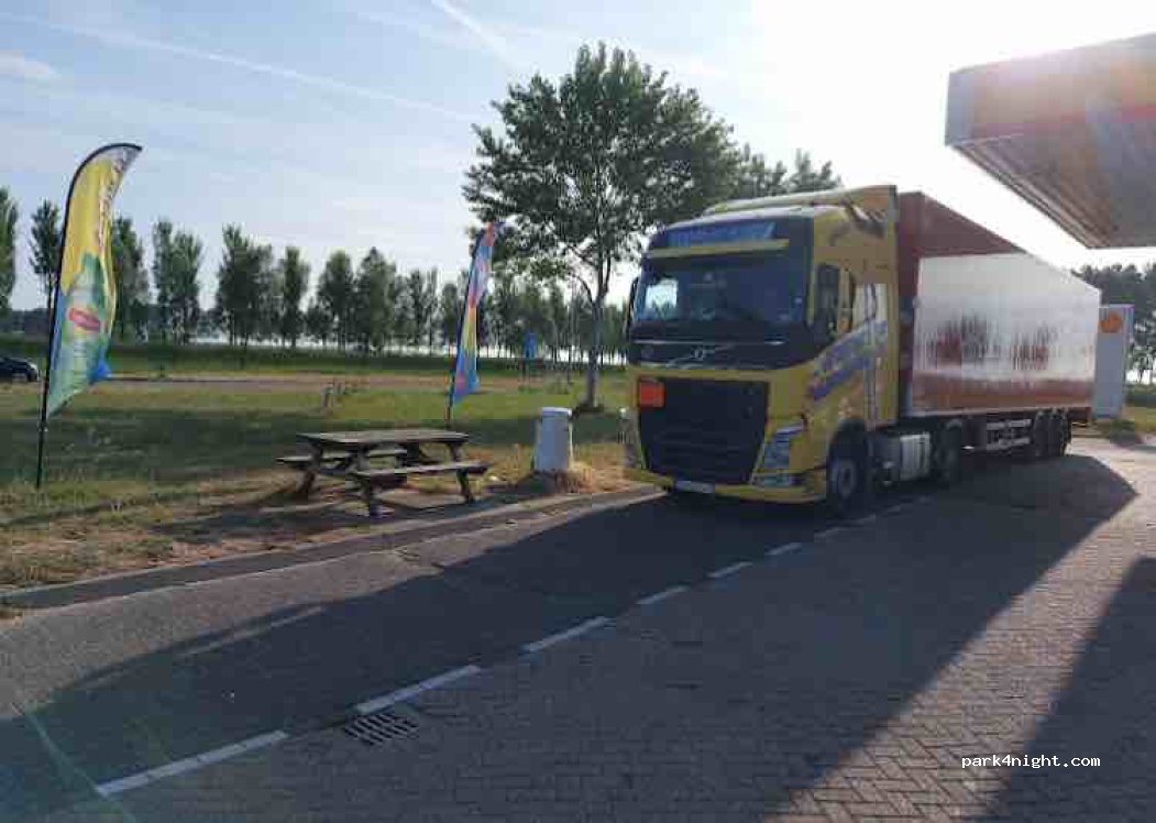 Op deze parkeerplaats wordt parkeren en slapen toegestaan. Er zijn prullenbakken. Deze parkeerplaats wordt ook gebruikt voor vrachtwagens. Er is een tankstation. Indien geopend is hier een ruim aanbod van eten, drinken en toiletten. Rondom de parkeerplaats rijdt veel verkeer. Openbaar recreëren niet toegestaan. Geen voorzieningen. Wildplassen niet toegestaan. Zwerfafval verboden.