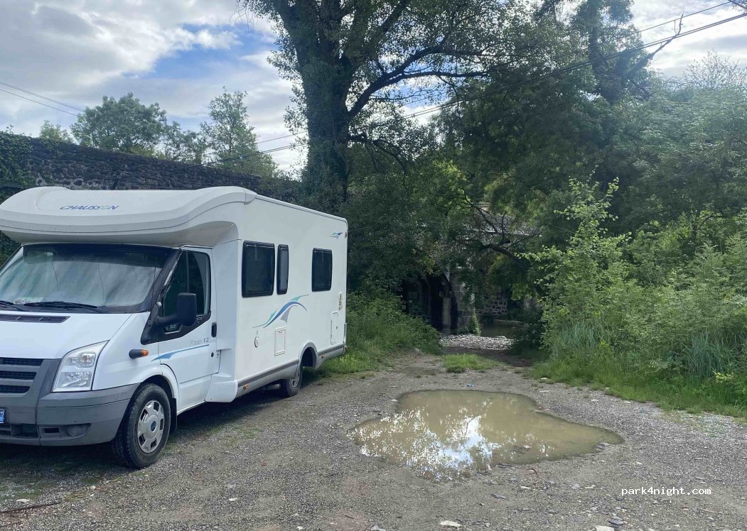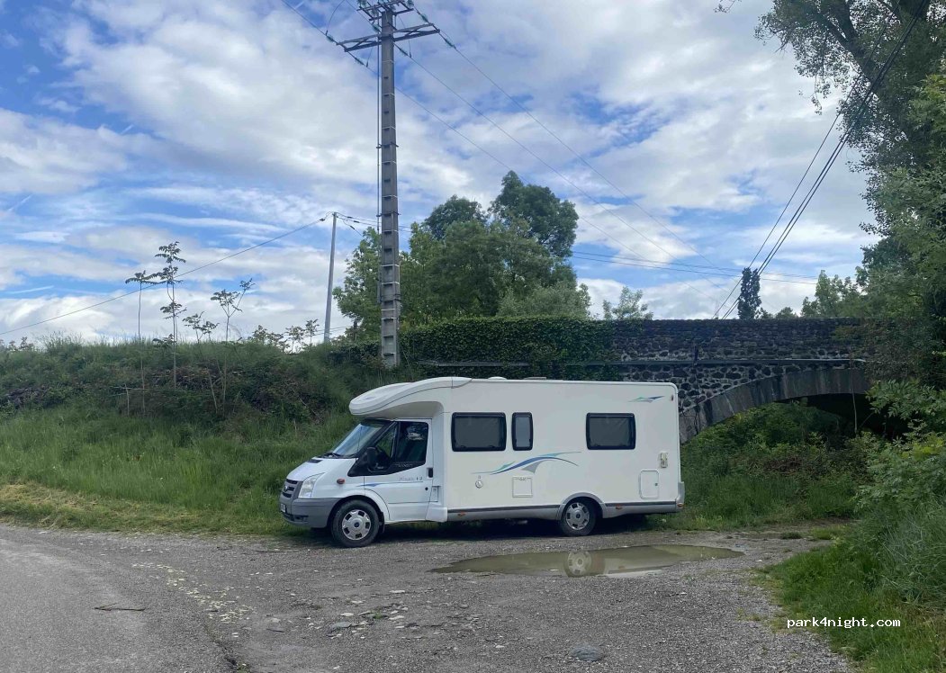 Petit renfoncement au bord d’une route très peu passante aussi bien le jour que la nuit. A deux pas d’une rivière et d’un petit pont en pierre. Très calme pour y passer la nuit.