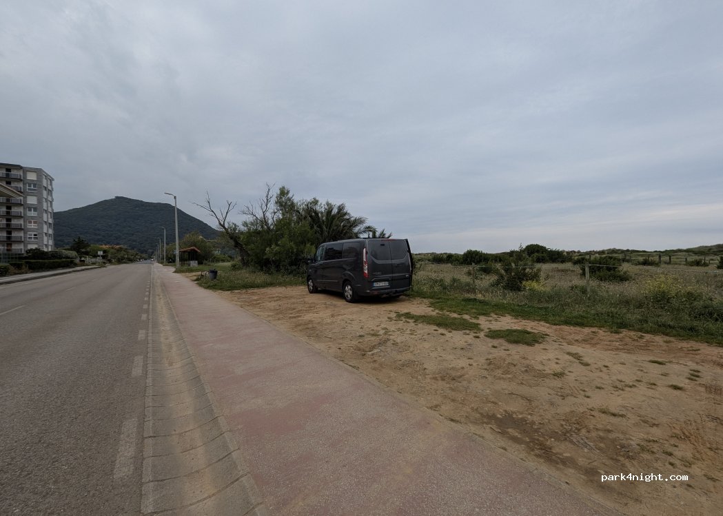 Parking le long de la principale route de la ville. Grands espaces. Aucun problème pour y passer la nuit au mois de mai, la situation peut être plus difficile en haute saison. Pour notre camion de 2,5m, c’est le seul lieu au bord de la plage qu’on a trouvé ! Toilettes propres à proximité. Douches sur la plage. Départ possible pour de magnifiques randonnées (ne louper pas le Faro del Caballo, c’est idyllique) !
