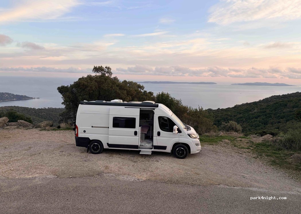A small spot with an incredible view of Île du Levant and Port-Cros. Just enough space for two vans. It's a forest road called the Route des Crêtes (Ridge Road). Sleeping there is prohibited, but you can park and walk around during the day without any problems. It's closed at night and sometimes during the day depending on the fire risk. This is one of the reasons why sleeping there is forbidden.