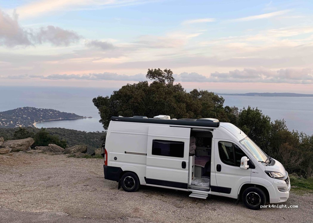 Ein kleiner Platz mit atemberaubendem Blick auf die Île du Levant und Port-Cros. Gerade genug Platz für zwei Vans. Es handelt sich um eine Waldstraße namens Route des Crêtes (Kammweg). Übernachten ist dort verboten, aber tagsüber kann man problemlos parken und spazieren gehen. Die Straße ist nachts und je nach Waldbrandgefahr manchmal auch tagsüber gesperrt. Dies ist einer der Gründe für das Übernachtungsverbot.