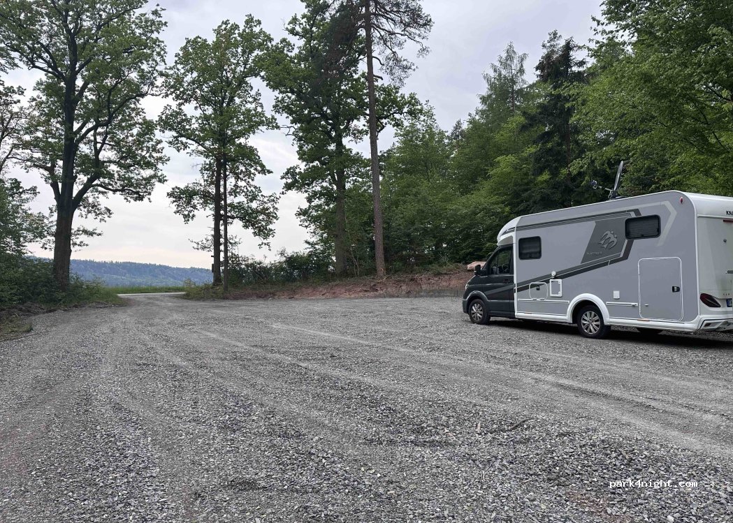 Wanderparkplatz, offensichtlich frisch vergrößert und neu geschottert. Keinerlei Infrastruktur, sehr ruhig, weitgehend eben.