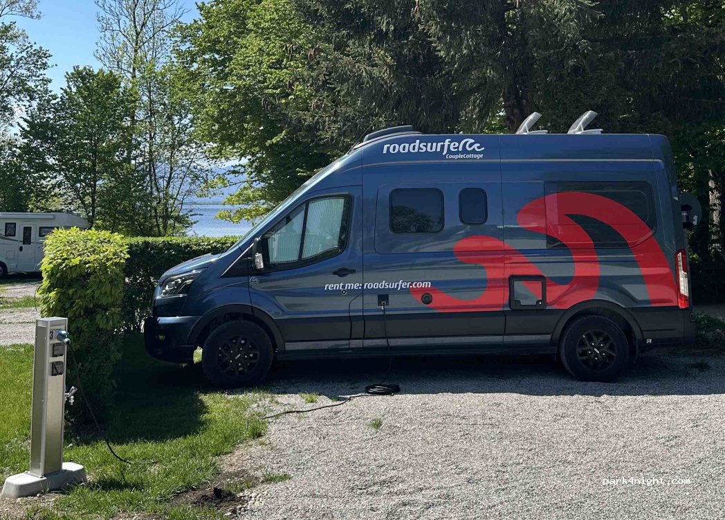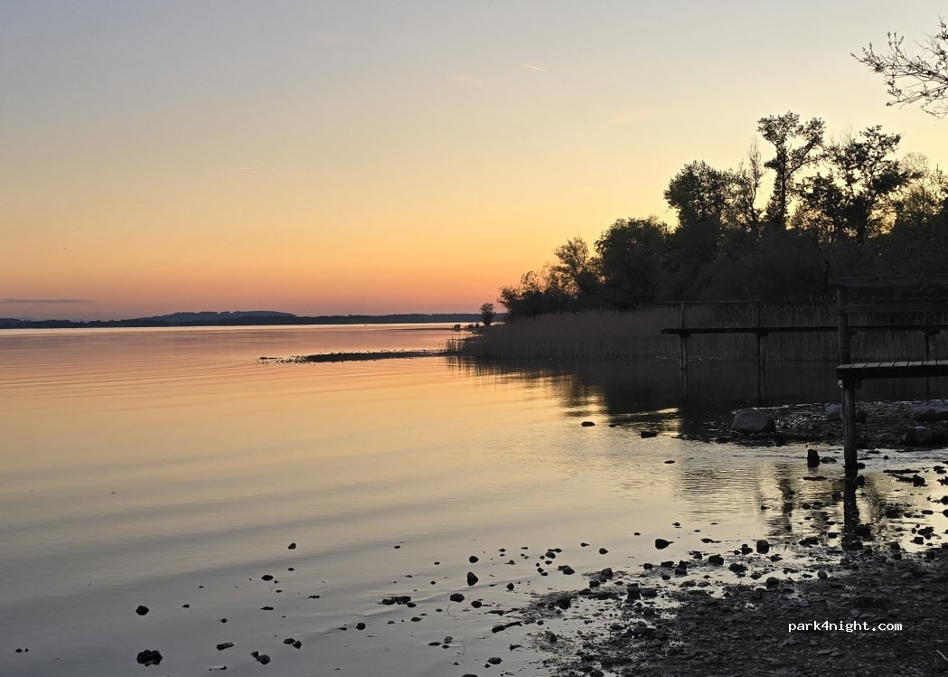 Magnifique camping sur la plage. Situation calme, pas de routes très fréquentées à proximité. Convient aux petits camping-cars car l'accès est un peu étroit. Vous pouvez précommander des petits pains frais. Les sanitaires étaient toujours propres et la température de la chambre était bonne même s'il ne faisait que 10 degrés dehors le soir. Une machine à laver les cassettes WC est disponible et coûte 4€. Malheureusement, la machine à laver était actuellement en panne. Une promenade de 30 minutes vous amène à Chieming où vous trouverez Edeka, des glaciers et une boulangerie. Électricité et eau sur place