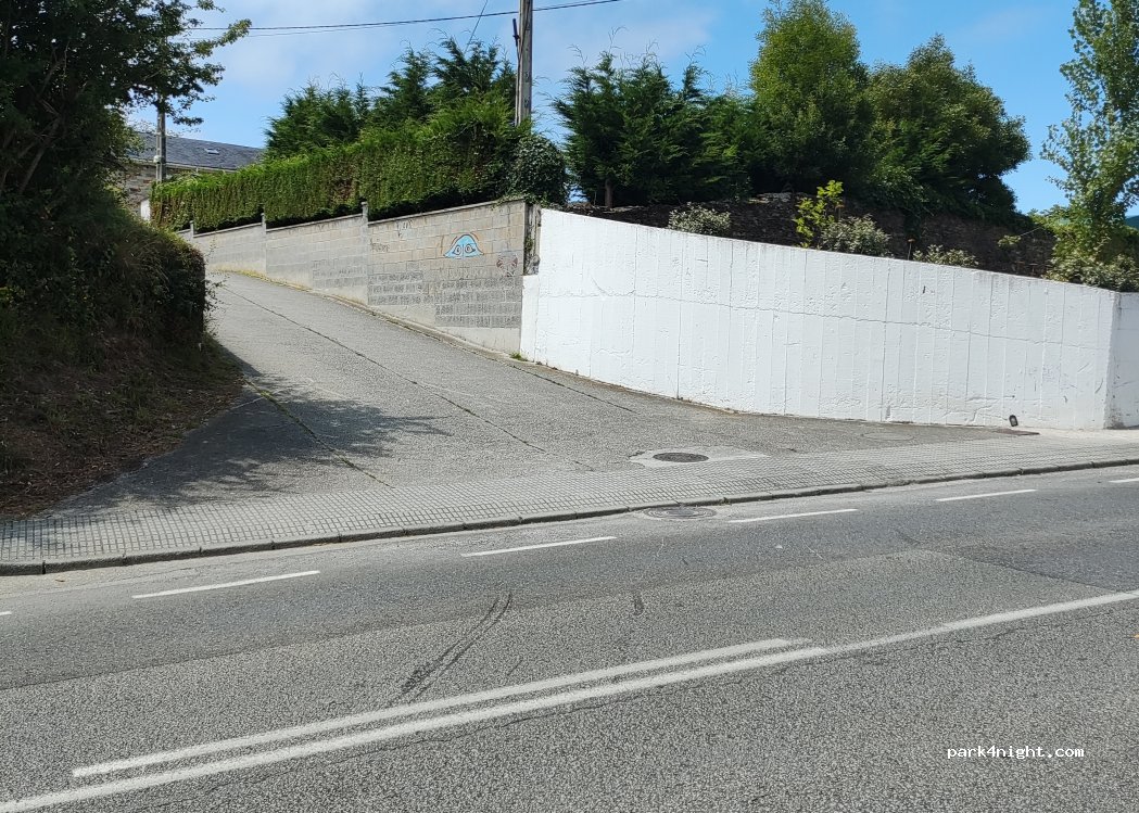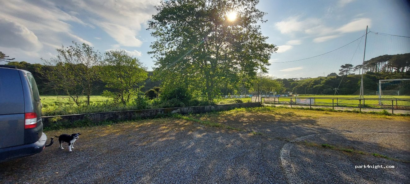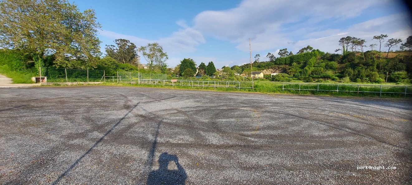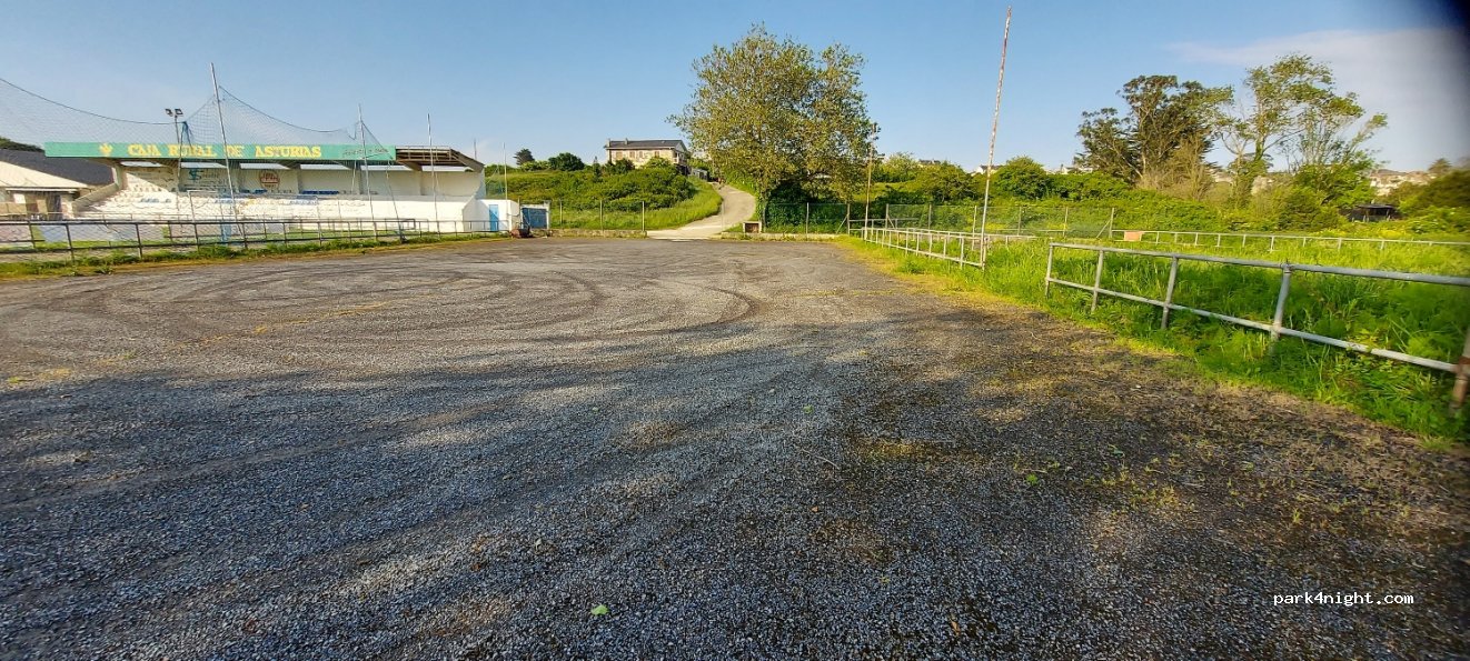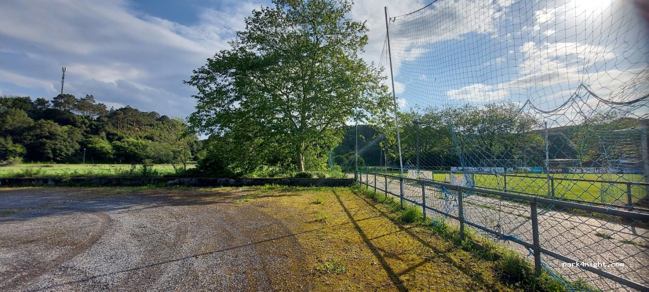Gran opción para dormir en un lugar llano y tranquilo. Parece el aparcamiento del campo de fútbol, muy cerca de la playa y a 5- 10 minutos del centro del pueblo. No es de lo más bonito pero si tranquilo.