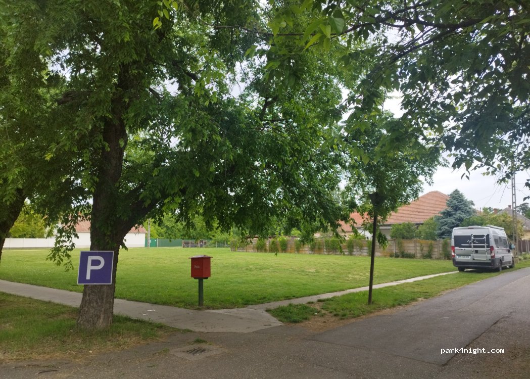 Grassy parking lot opposite the church in the town center. Along a quiet road between 10 p.m. and 6 a.m.