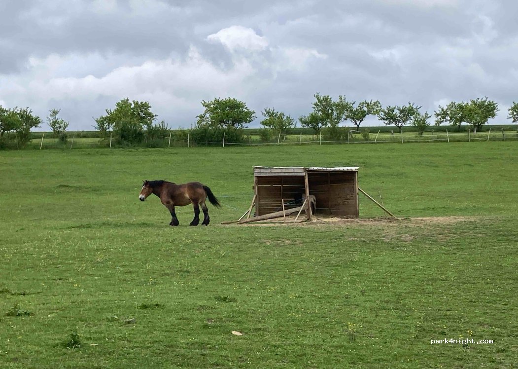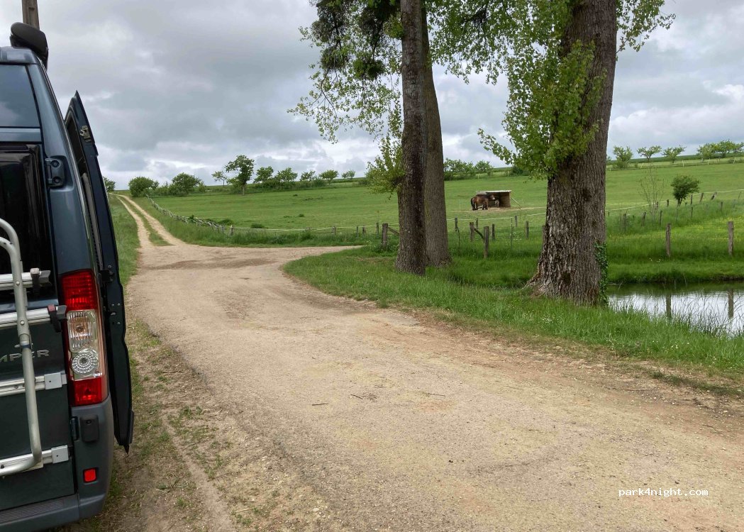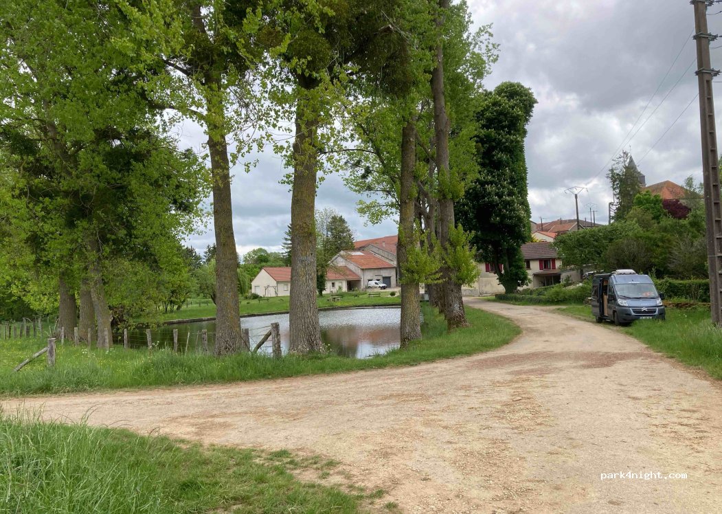 Endroit bucolique en limite du village et des champs au bord d’un petit étang. Parfait pour une nuit. Benne à verre à proximité.