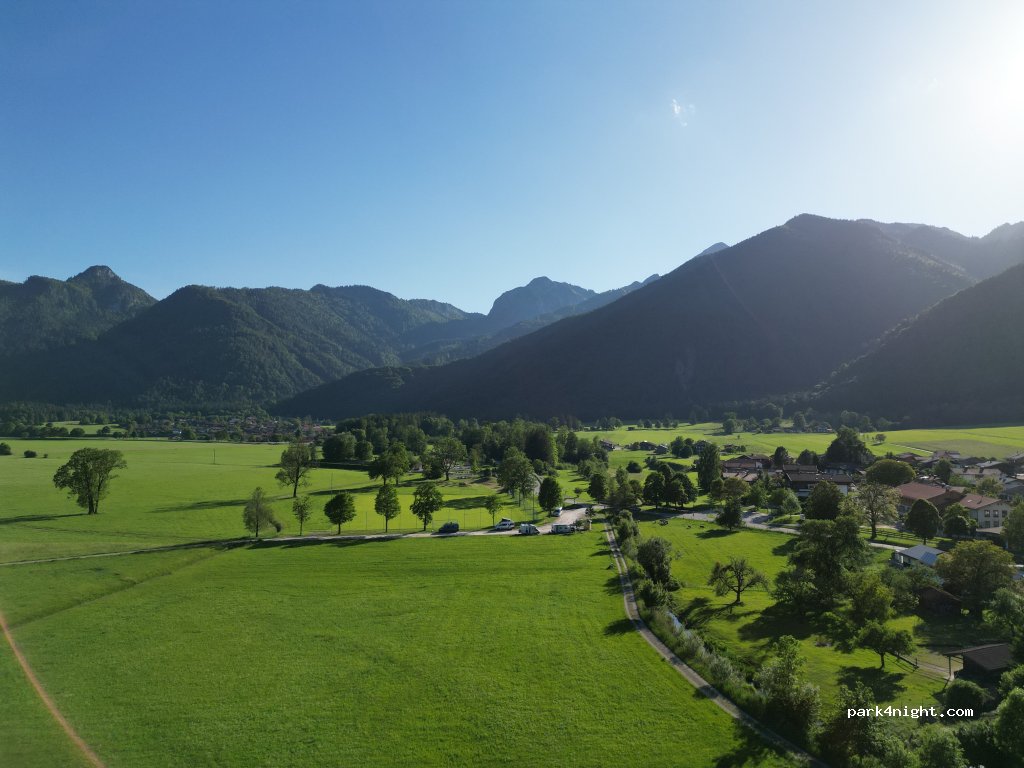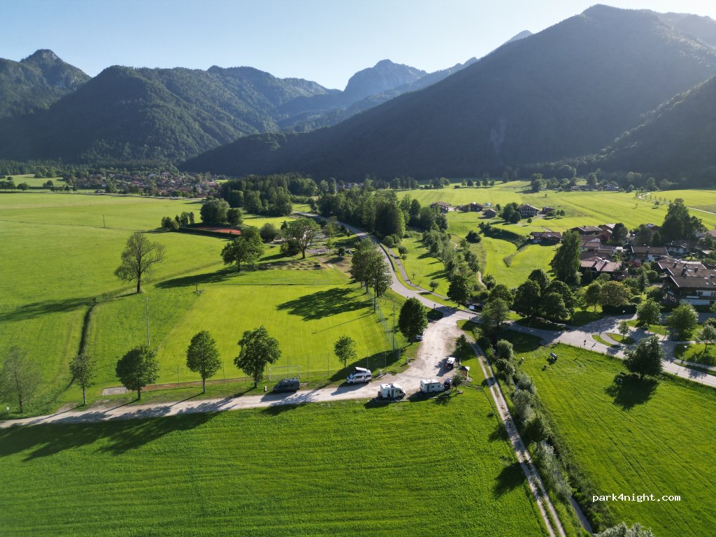 The campervan site in the mountaineering village of Schleching warmly welcomes you. You can pay for the parking space (fees apply) at the sports field directly with your mobile phone (QR code => green sign) or at the parking meter. Newly renovated restrooms are located at the village square, approximately 100 meters away. These are open from 6:00 AM to 10:00 PM and can be used free of charge.