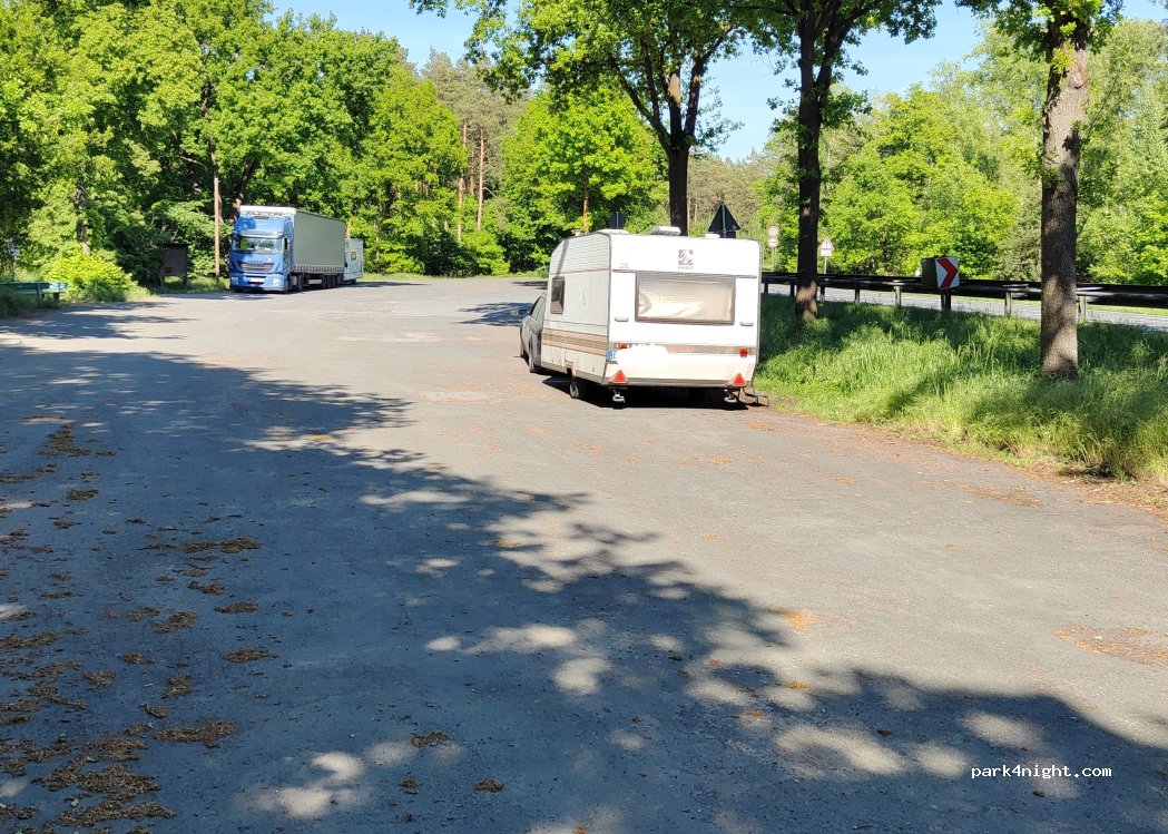 Mehrere Stellmöglichkeiten auch für größere Fahrzeuge. Bereich ist geteert, aber die Straße ist über Tag stark befahren. Es sind feste Tische und Bänke vorhanden. Aber keine Mülleimer, also bitte wieder mitnehmen.