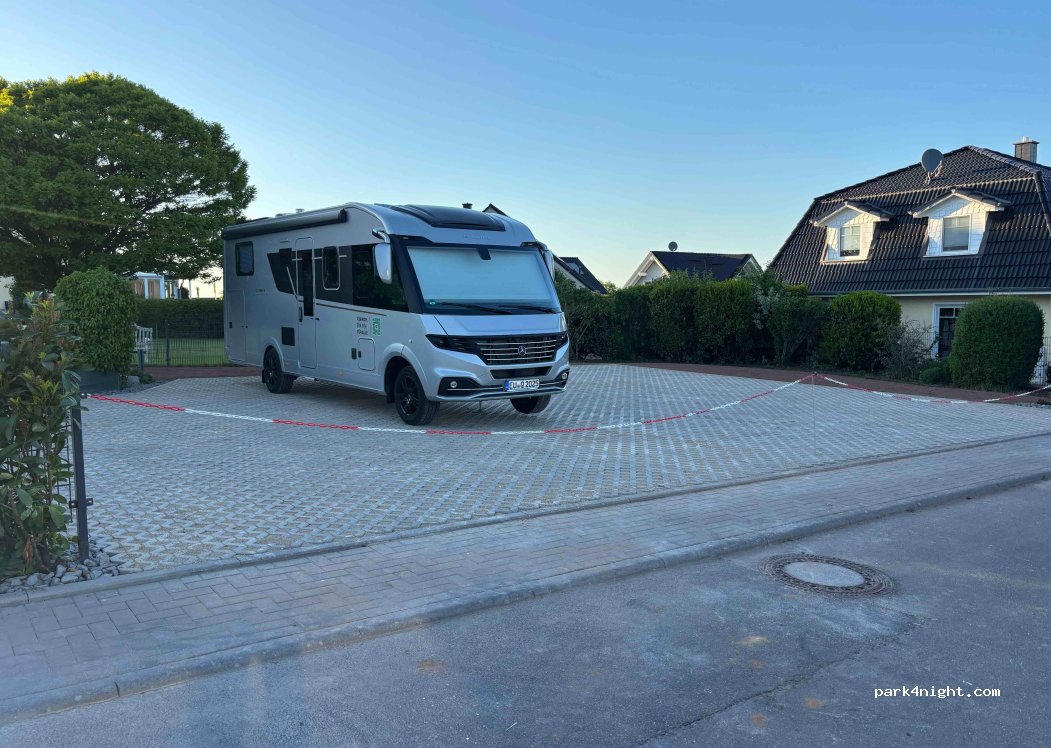 Good hard standing slight slope left to right , no facilities but if you ask the guy you can get water from the garage ( need a container) very quite at night . Not really close to anything it’s a residential street . Space for 3 motorhomes