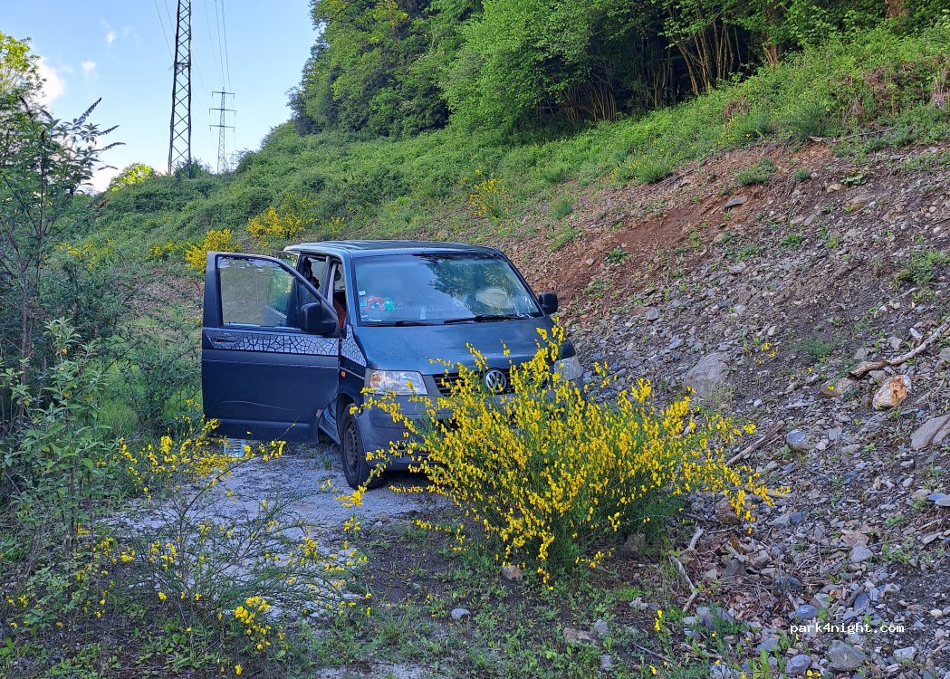 A flat, elevated area almost entirely hidden by vegetation, with views of the mountains and the river below. It's very quiet and shaded in the morning.