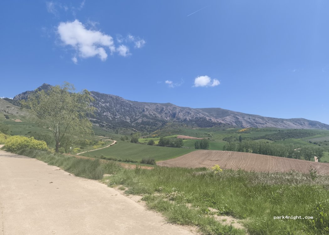 Precioso entorno, un poco inclinado pero se soluciona con calzos. 100% tranquilidad, descanso garantizado. Aparte de la zona de llenado, hay una fuente con más presión de agua y una mesa de cemento. Las calles del pueblo son anchas. Los paisanos muy amables. Un 10 al pueblo por acogernos a las AC.