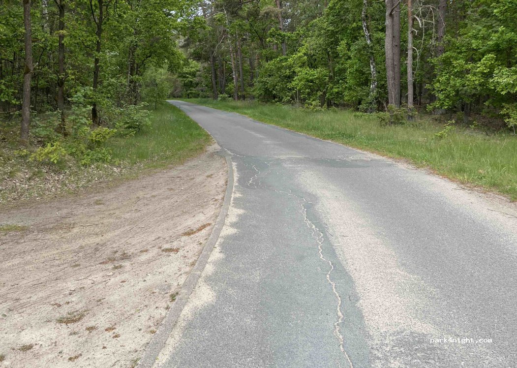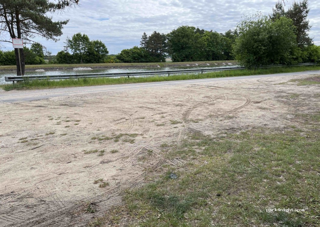 A small parking lot directly between the canal and the forest. The road there is paved and easily accessible. It's also suitable for larger motorhomes. The occasional car passes by. You'll also find anglers and cyclists here. It's very quiet at night, and the bridge is also quiet. Perfect for a night!