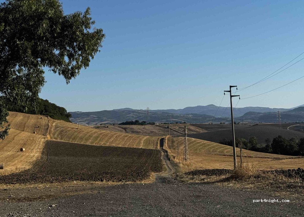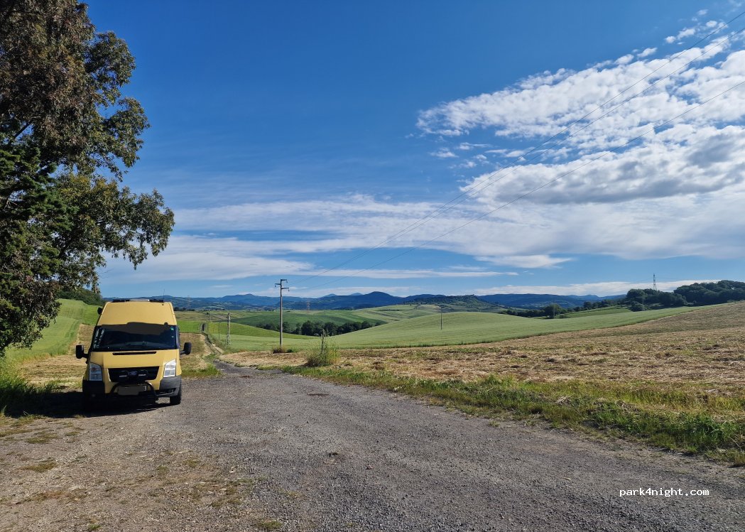 We spent a quiet and pleasant night here and drove to the hot sulfur springs of Saturnia early in the morning. The parking space is a gravel parking lot next to the road, at the edge of a dirt track.