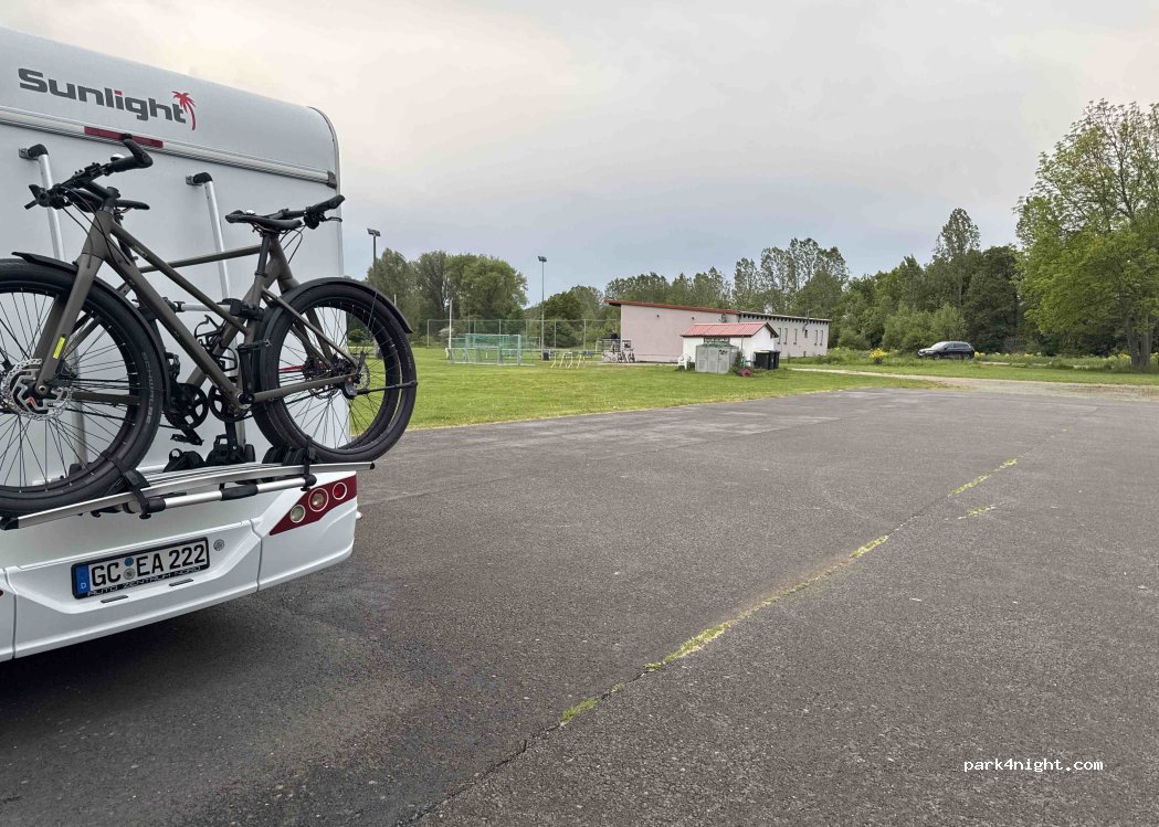 Una hermosa área asfaltada en un parque infantil y campo deportivo. El carril bici hacia Erfurt pasa justo delante. Podrás utilizar los baños durante los partidos. No hay señales presentes. Libre y muy tranquilo por la noche.