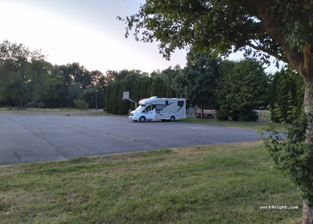 A beautiful paved area next to a playground and sports field. The bike path to Erfurt runs right past. Restrooms are available during playtime. No signs. Free and very quiet at night.
