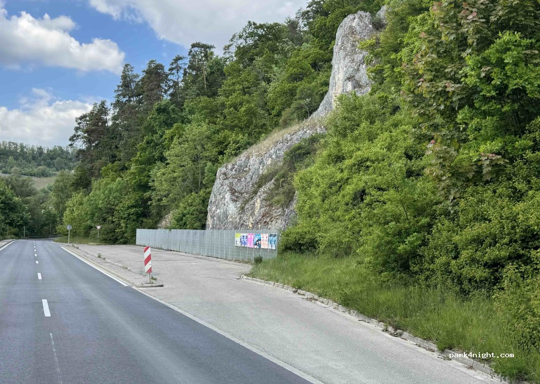 Medium-sized emergency parking space for one night. No prohibition signs. Asphalt, slightly sloping. No infrastructure. Protestant church opposite. Right on the road, but light traffic at night. Church bells may be disturbing. Relatively close to the A8.
