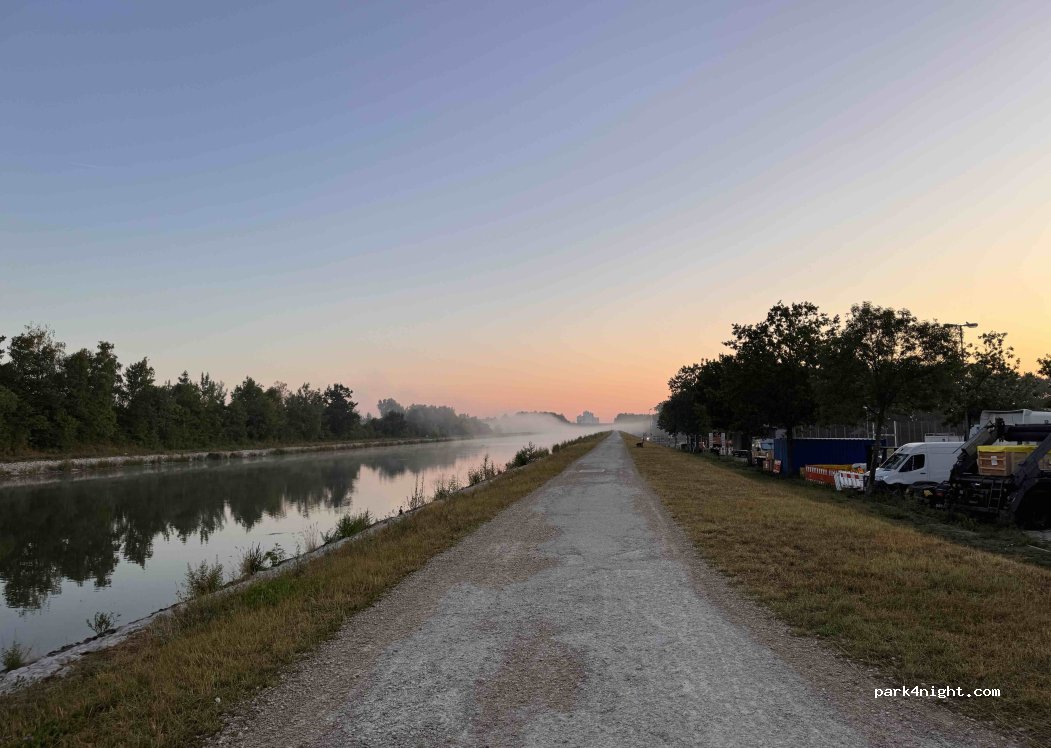Am Kanal kann man sicherlich schön spazieren gehen. Der Parkplatz wurde allerdings mit 2,5 m Höhenbegrenzung versehen. Also nur für Mini-Camper geeignet. Zudem waren viele Leute vor Ort und einige Lagerfeuer brannten. Das war nichts für uns.