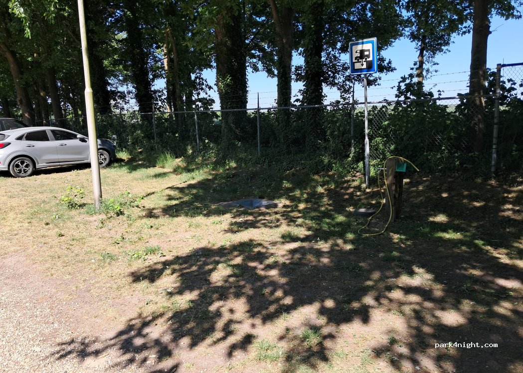 Hay un vertedero de aguas grises disponible, pero prácticamente inaccesible debido a su ubicación cerca de una valla, una farola y un grifo de agua.