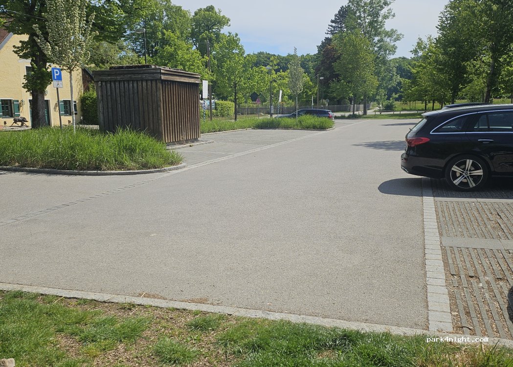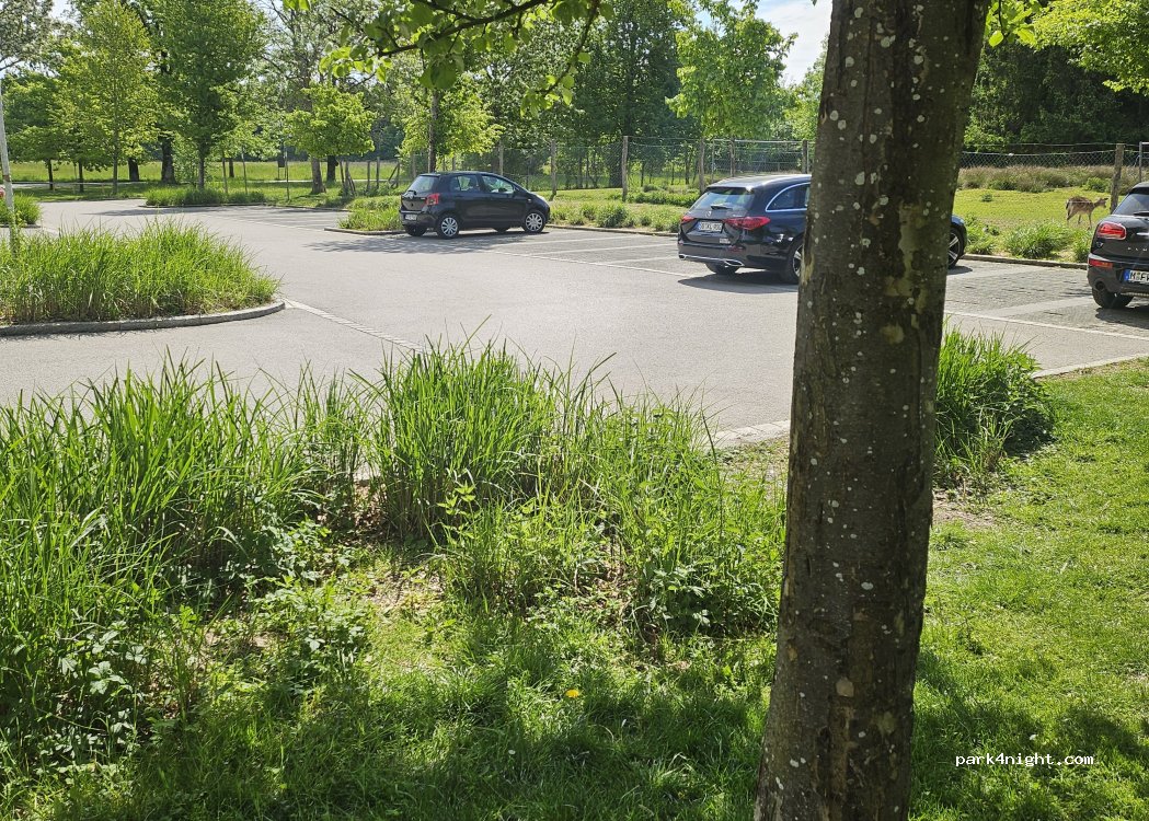 Öffentlicher, von Bäumen gesäumter Parkplatz inmitten wunderschöner Landschaft, neben einem kleinen Wildgehege und einer Fahrradvermietung. Die schöne Umgebung lädt zum Spazierengehen und Radfahren ein.