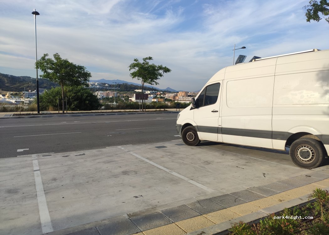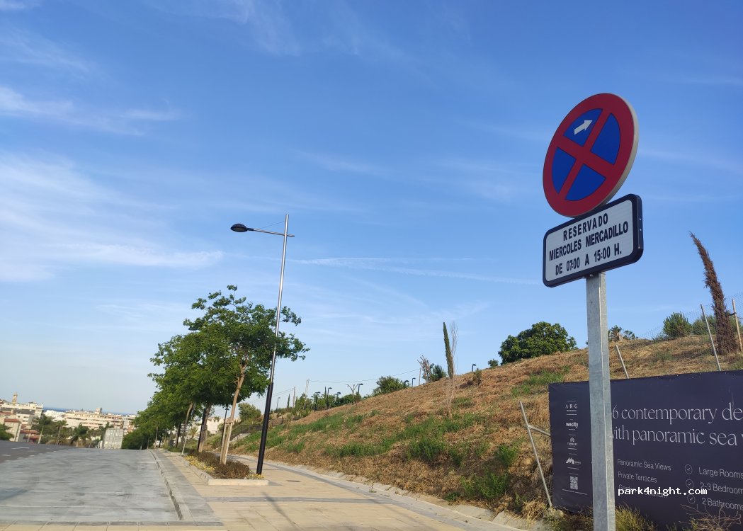 Amplio parking en urbanización en construcción, junto a parque infantil. Inclinado, pero bastante recto. Muy tranquilo por la noche.