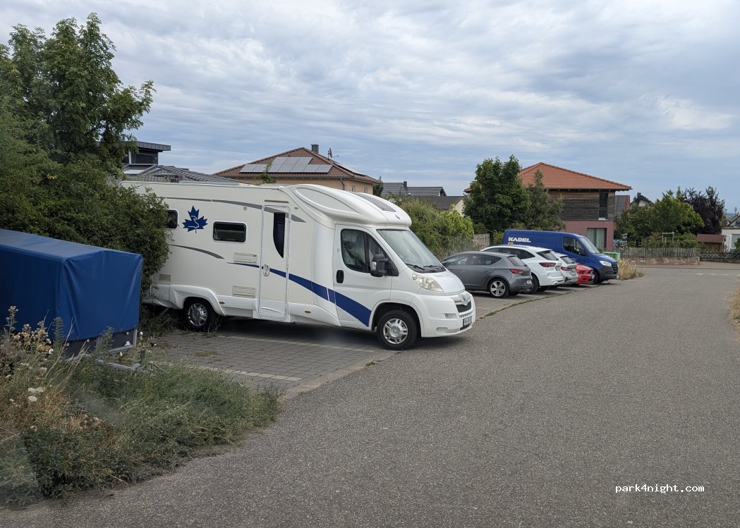 Aparcamiento tranquilo de siete plazas a las afueras del pueblo, justo al lado de los viñedos. Adecuado para campistas autosuficientes. Por aquí pasan numerosas rutas de senderismo, la ruta del vino, la ruta del castillo de Hambach, la ruta de los almendros en flor, etc.
