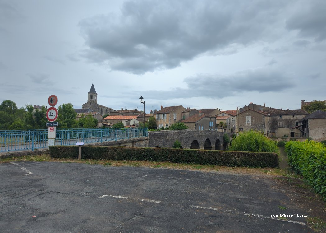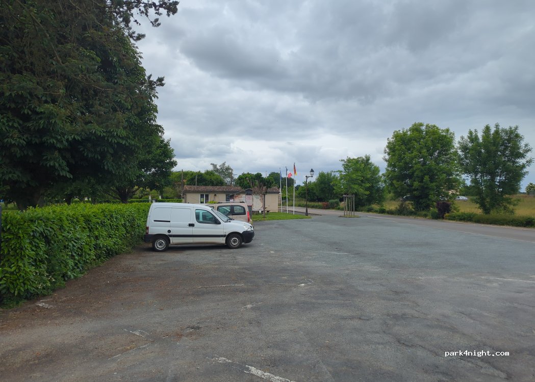 Parking et aire de pique-nique avec vue sur le village situé sur une route calme. Aucune limite de hauteur.