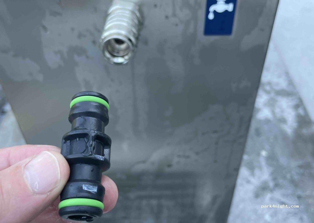 El 14/07/2025 observé que han modificado la conexión de agua. Ya no se necesita un adaptador macho-macho. Ya han instalado un adaptador macho "fijo" con cable para que la gente no se lo lleve. Solamente con el típico adaptador hembra de conexión rápida ya está. Además han añadido una válvula que puedes regular el caudal.