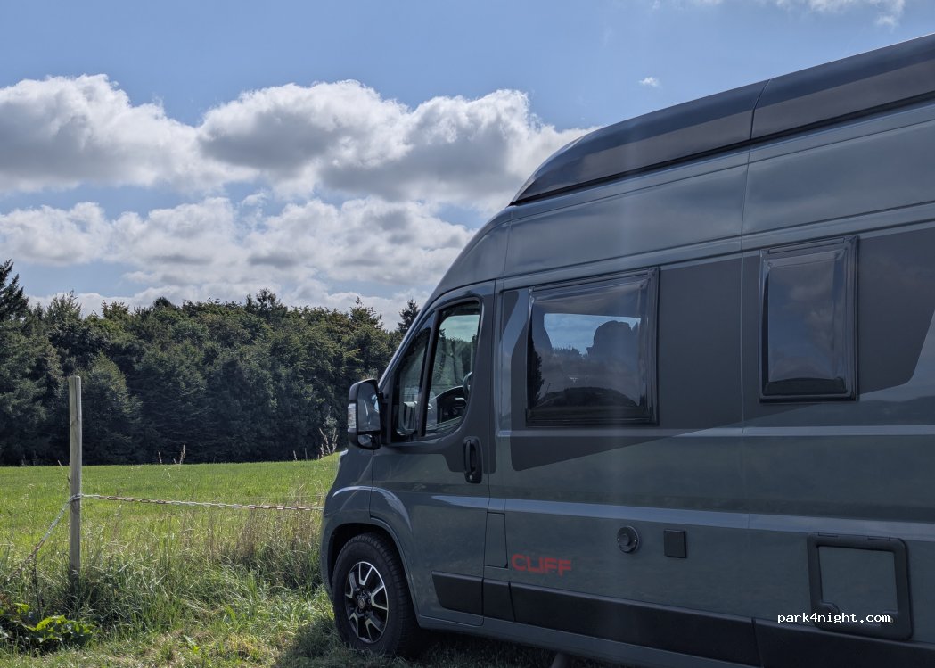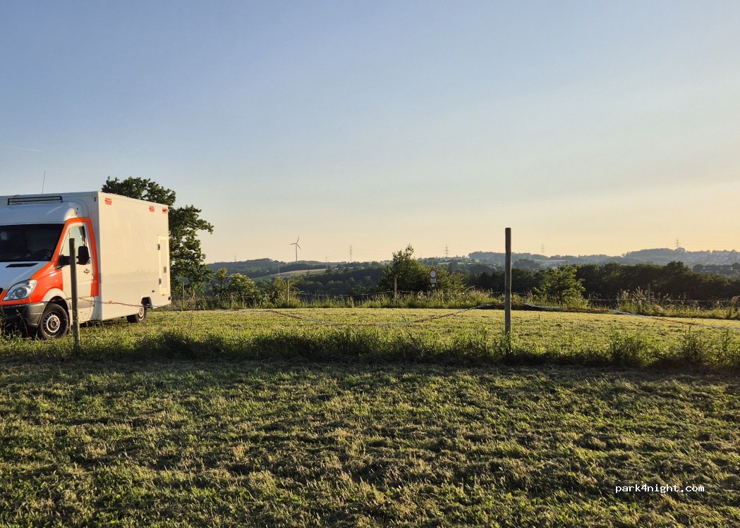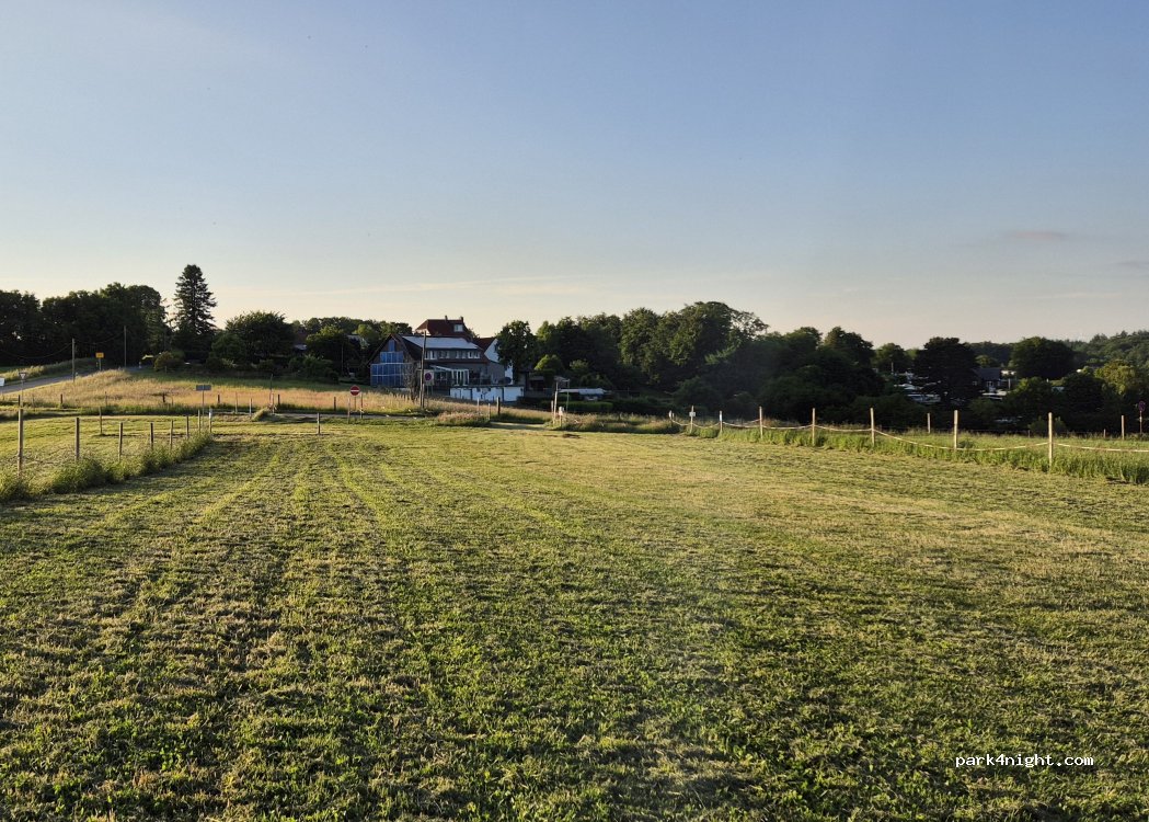 Großer Parkplatz auf einer Wiese für ca. 100 Fahrzeuge mit wunderbarer Aussicht über die Landschaft und einem sehr schöner Sonnenuntergang. An einer Straße gelegen, jedoch nachts mit wenig Verkehr. Tagsüber beliebt bei Motorradfahrern.