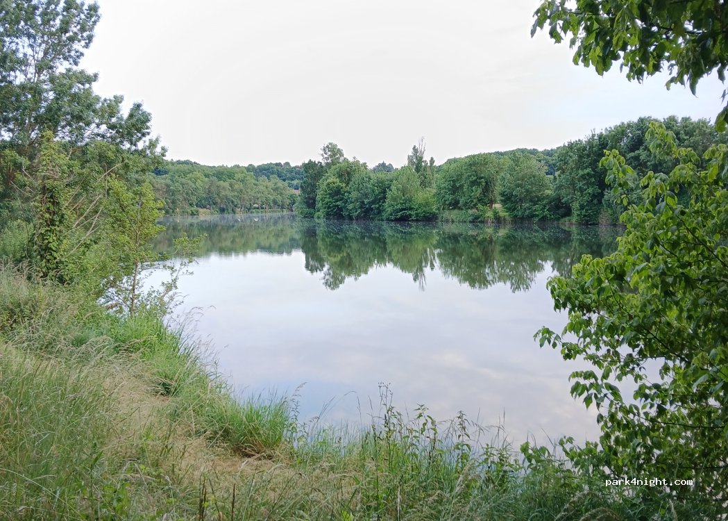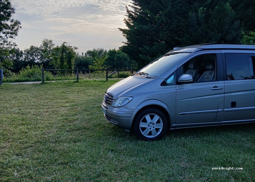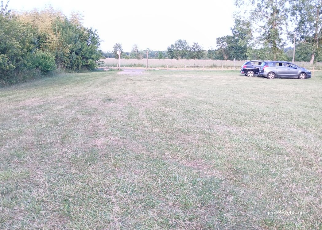 Grassy area accessible to vans and light vehicles only. Cycle path nearby. Relatively quiet. Along the Cher River. Frogs and birds singing. Nice spot