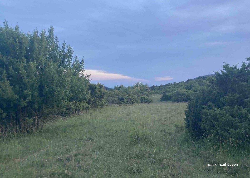 Sur un plateau , loin de tout , très calme . 1,5/2 km de piste caillouteuse. Vue sur le pic saint loup vers l’Est . Le sentier continue plus loin avec une vue sur la mer . Pas d’animaux, pas d’insectes .
