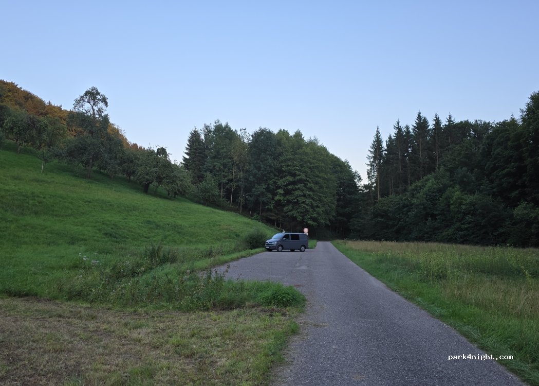 Parking de randonnée calme à côté d'un ruisseau et en contrebas de la route peu ou pas fréquentée. Surface asphaltée presque plate.