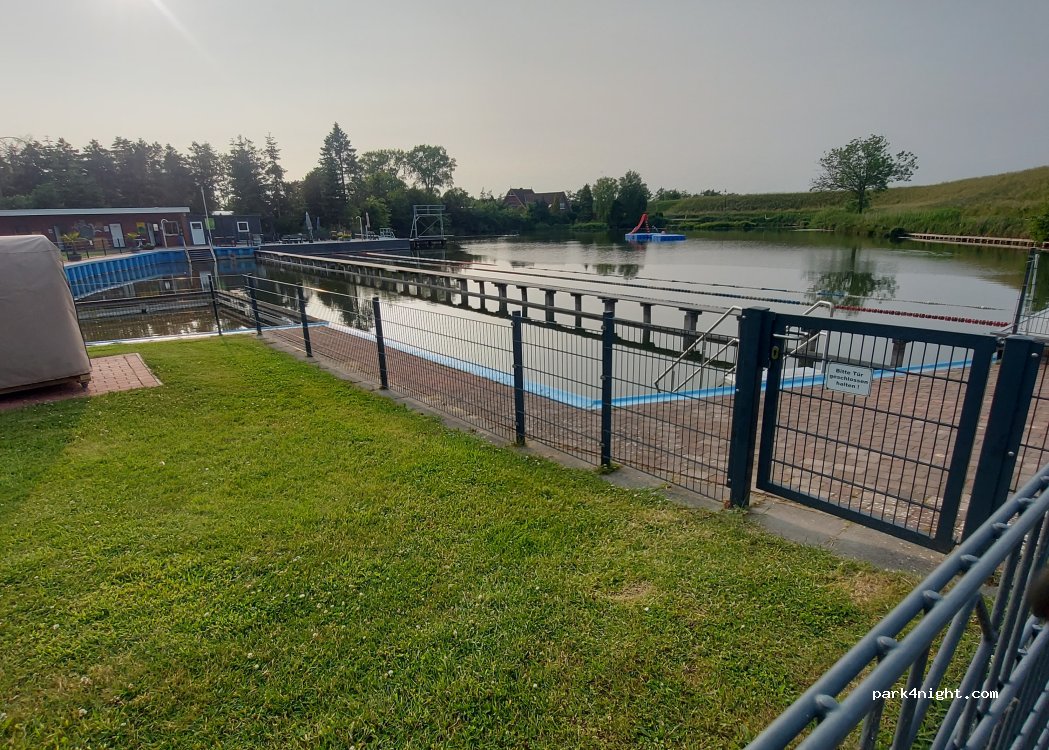 Vor dem Platz befindet sich das Naturfreibad Krummendeich mit Bade-, Entspannungs- und Spielmöglichkeiten.