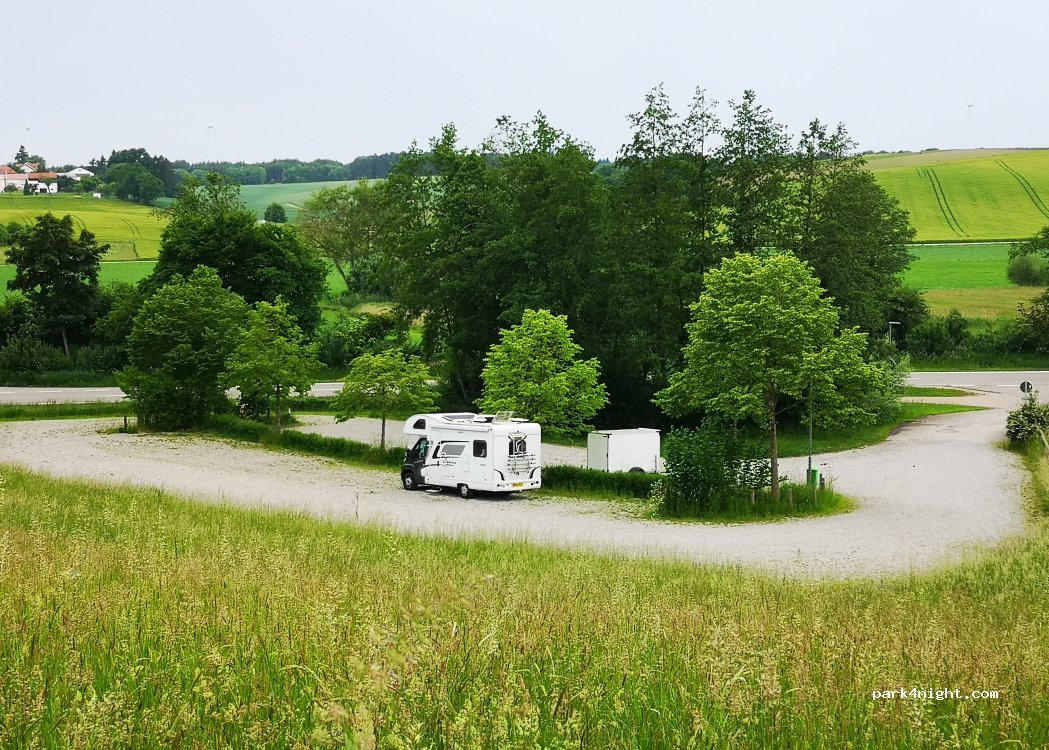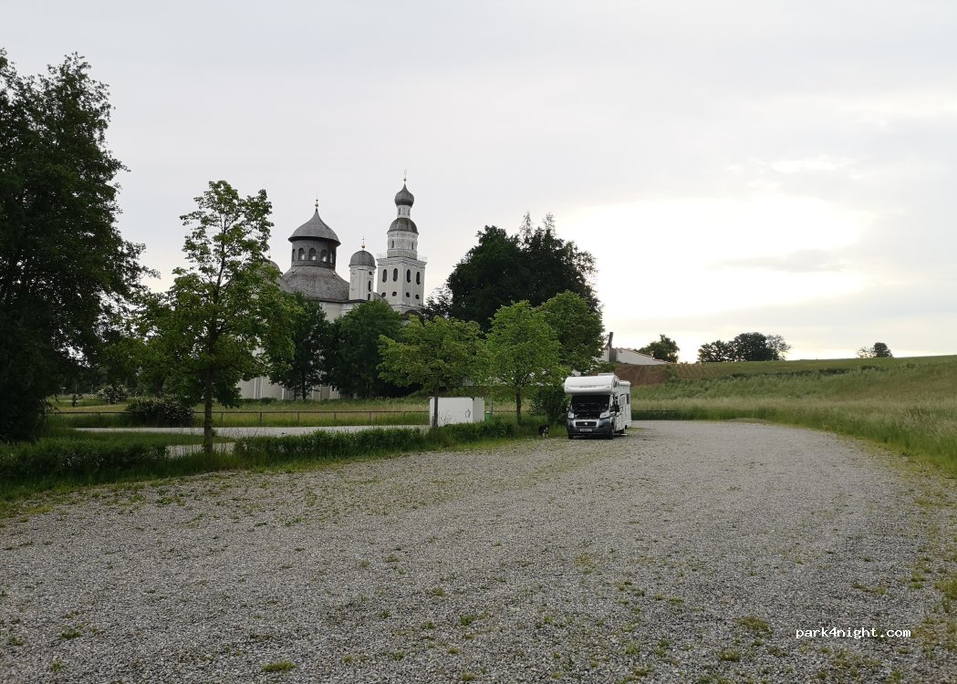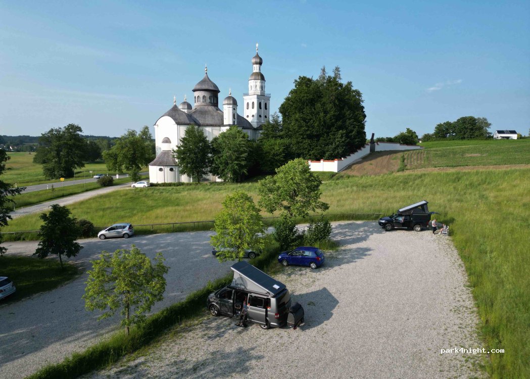 Aparcamiento junto a la iglesia de Maria Birnbau, cerca de la autopista 8. Terreno llano, con gravilla y amplios espacios. Prohibido el paso de camiones, pero sin restricciones para coches y caravanas.